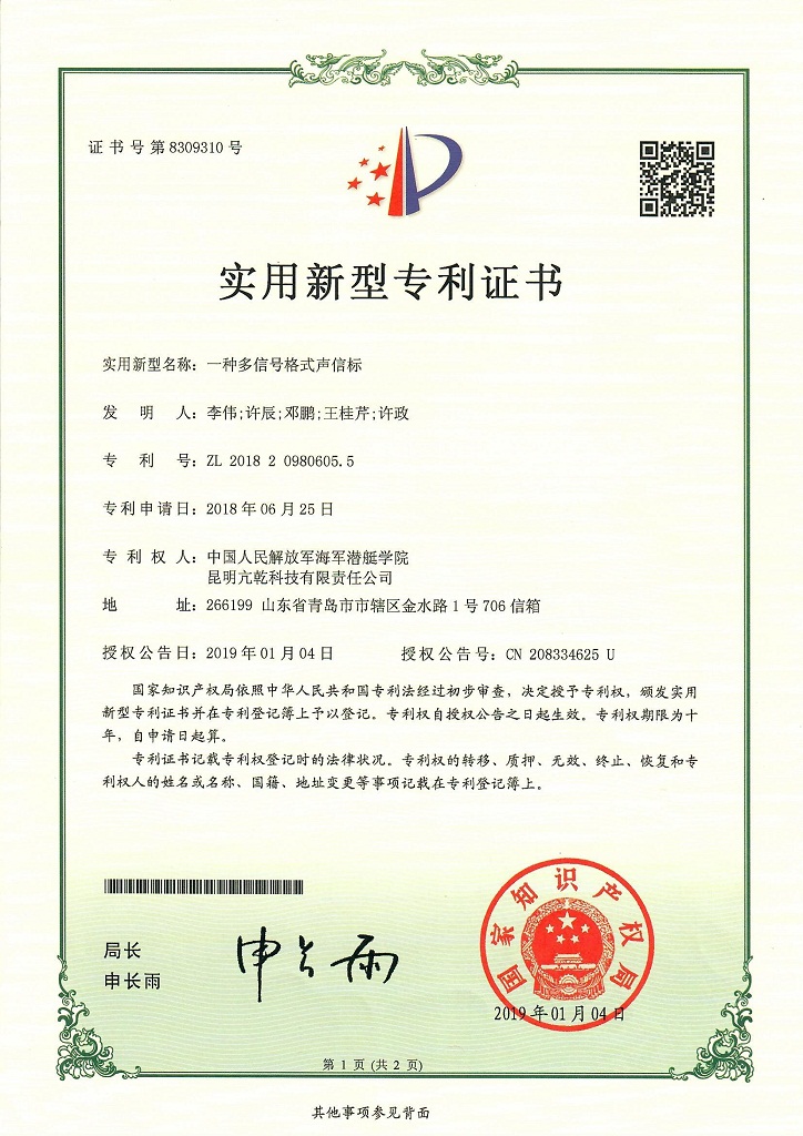 一种多信号格式声信标专利(与中国人民解放军海军潜艇学院共同完成),主要用于对水下目标定位,或连续测量水下目标的运动轨迹。用该专利研制的声信标,可以通过接收声信号指令,设置信标发射声信号的格式。